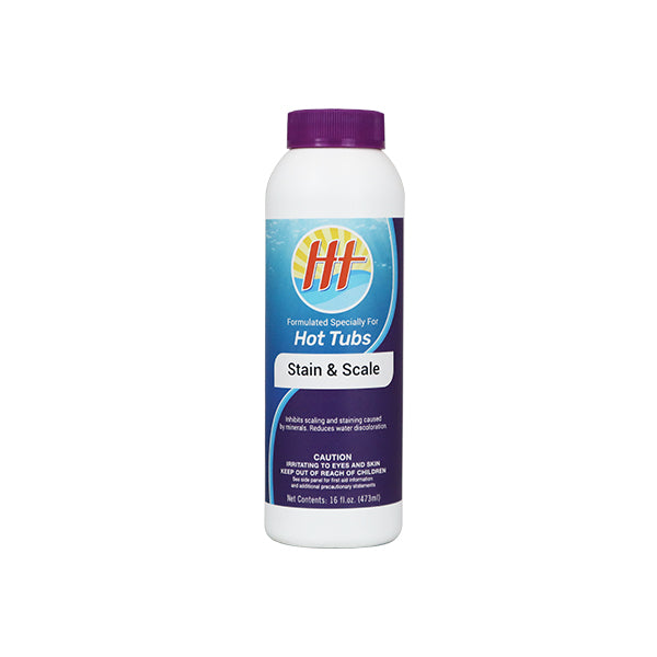 HT Stain & Scale is a very effective in inhibiting the formation of rusty, green, brown, or cloudy water. This discoloration is primarily due from the presence of metallic or mineral impurities, such as copper, iron, and manganese salts in your water supply or the result of corrosive action of acidic water (low pH). Warning: excessive scaling within your water could cause corrosion of your heating element and discoloration of the spa acrylic surface. Proper use of Stain & Scale in cooperation with Protection Plus protects your spa and equipment. RECOMMENDED USE: Each time you refill your spa add 16 oz of HT Stain & Scale on spas up to 500 gallons. Stain & Scale should be added while you are filling the spa. Within 24 hours of adding the 16 oz of Stain & Scale you should remove and clean your filter cartridges. For spas with high concentration of minerals or those showing signs of rusty water or scaling be sure to follow a maintenance program of adding 1 oz of Stain & Scale per each 100 gallons of water each week.